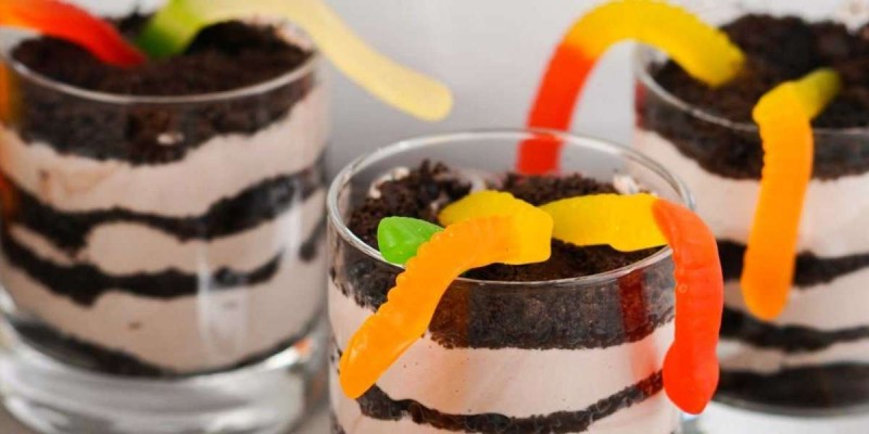 Agora, é hora de montar. Camadas alternadas de biscoitos esfarelados e mistura de iogurte em um copo estilo copo. Certifique-se de que a última camada seja feita de biscoitos esfarelados, pois esta será a “lama” para as minhocas.