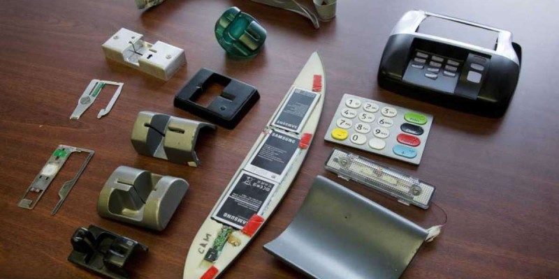 Os ladrões também usam teclados falsos, escumadeiras Bluetooth e dispositivos de "card shimming" (tiras finas de papel que se escondem dentro de um slot de cartão esperando para clonar a tarja magnética de um cartão de pagamento).