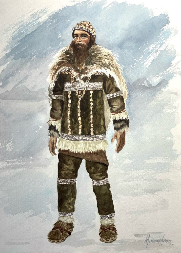 Impressão artística de roupas sob medida decoradas no Paleolítico Superior. Crédito: Mariana Ariza