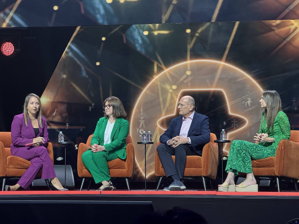 Palestra principal sobre segurança eleitoral no Black Hat 2024. Da esquerda para a direita, Christina Cassidy, Associated Press; Felicity Oswald, NCSC; Hans de Vries, COO ENISA; Jen Easterly, diretora da CISA