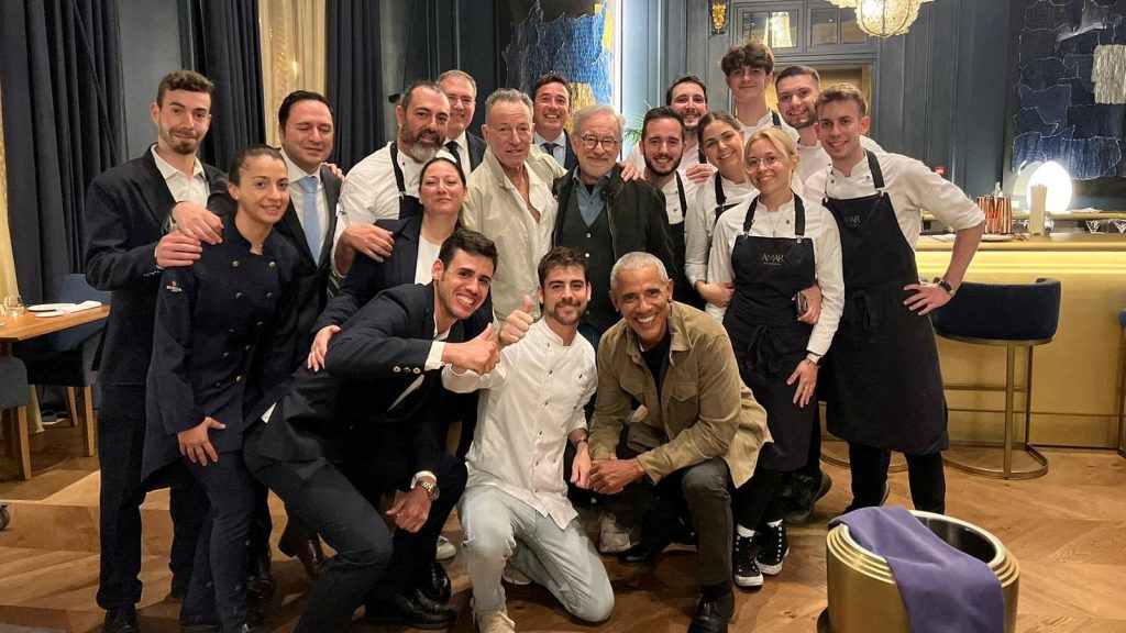 Portanto, não é surpresa que a equipe de garçons em Barcelona tenha pensado duas vezes quando o ex-presidente dos Estados Unidos, o icônico cantor e compositor e o diretor vencedor do Oscar sentaram-se para comer algo no restaurante Amar no Palace Hotel na quinta-feira.