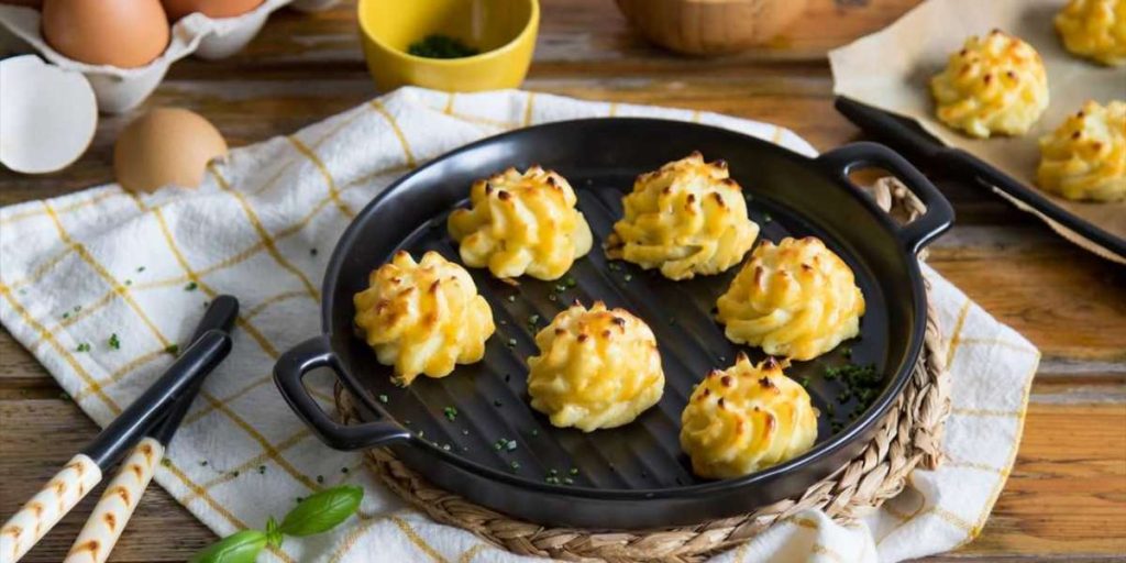 Pré-aqueça o forno na função de grelha alta Prepare o puré de batata com o leite e o whey. Misture o puré de batata com o requeijão light, uma pitada de pimenta e pimenta e noz-moscada a gosto. Deixe temperar. Coloque a mistura em um saco de confeitar com um bico grande estrela e faça as pilhas em uma assadeira com papel vegetal. Pincele com a gema de ovo e cozinhe por cerca de 6-8 minutos até que comecem a dourar.
