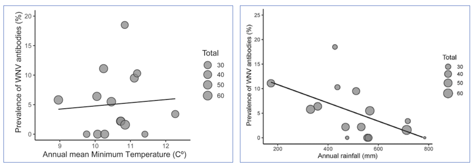 Veriler, yıllık minimum sıcaklık ne kadar yüksek olursa seroprevalansın da o kadar yüksek olduğunu gösterdi. Benzer şekilde, yıllık yağış miktarı ne kadar düşük olursa seroprevalans da o kadar yüksek olur, ancak bu da yılda yağışlı gün sayısının artmasıyla birlikte artar. Yani yağmur az da olsa yılın geneline daha çok yayılmışsa.