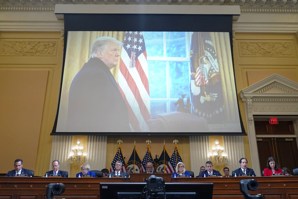 ARQUIVO – Uma foto do então presidente Donald Trump no Salão Oval com seu casaco ainda vestido quando ele volta de falar no Ellipse em 6 de janeiro, enquanto o comitê seleto da Câmara que investiga o ataque de 6 de janeiro ao Capitólio dos EUA detém uma audiência no Capitólio em Washington, quinta-feira, 13 de outubro de 2022. Em uma medida extraordinária, o comitê da Câmara em 6 de janeiro votou na quinta-feira para intimar o ex-presidente Donald Trump. (Foto AP/Jacquelyn Martin, Arquivo)