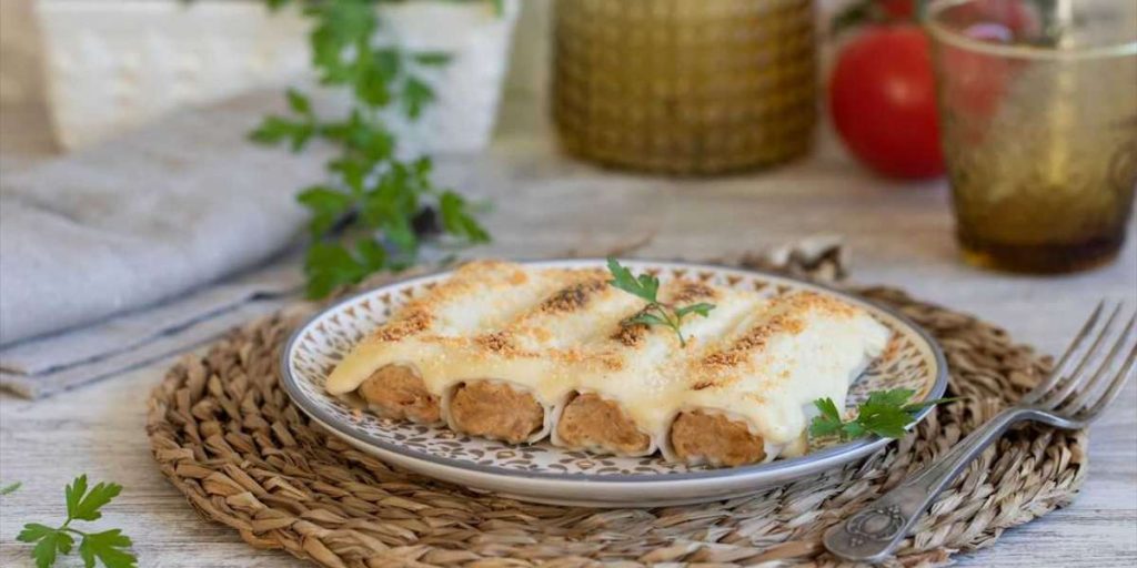 Preparação do recheio: Doure a cebola picada e o dente de alho num pouco de azeite até dourar ligeiramente. Adicione o frango cortado em pedaços e a carne picada e refogue por 10 minutos; Junte o tomate ralado, e deixe reduzir alguns minutos. Adicione pimenta e cozinhe por 20 minutos em fogo muito baixo. Mergulhe o pão no leite com whey e adicione à carne. Passe a carne pelo picador e acrescente colheres de sopa do molho de cozimento até obter uma textura fina e fina. Cubra a massa com filme plástico tocando na massa e coloque na geladeira.Preparação do bechamel: Refogue a farinha na manteiga até dourar. Despeje o leite, a noz-moscada, pimenta e uma pitada de pimenta e mexa continuamente com algumas hastes até atingir o ponto de ebulição, cerca de 5 minutos. Cozinhe os canelones de acordo com as instruções da embalagem. Passe-os por água fria e coloque-os sobre um pano de prato limpo. Recheie-os com a massa e coloque os canelones em uma assadeira. Cubra com o molho , polvilhe com o queijo e leve ao forno com a função gratinado, até dourar.