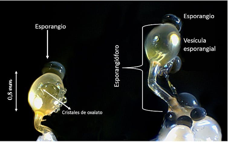 Vezikülün sonunda tek bir siyahımsı lentiform sporangium gelişir. Kesecik içindeki basınç yeterli bir düzeye (yaklaşık 7 atmosfer) ulaştığında, kesecik patlar ve sporangium 90 km/saat hızla dışarı fırlar. Bu, yerçekimi ivmesinin 20.000 katından daha fazla, sadece iki nanosaniyede 0’dan 20 km/s’ye hızlanma anlamına gelir. Bu, bir insanın ses hızının yüz katı hızla fırlatılmasına eşdeğer olacaktır.