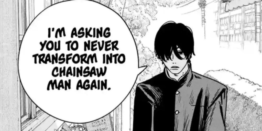 Depois de alguns capítulos intensos girando em torno do Falling Devil, os novos capítulos de Chainsaw Man foram mais sobre discussões e tramas sujas contra Denji, colocando-o em uma situação em que ele se sente impotente. O capítulo anterior não foi exceção, e a configuração para a próxima parcela parece ser mais do mesmo. Yoshida explica a situação para Denji sobre como as pessoas estão brigando por Chainsaw Man. Ele então pediu que ele nunca mais se transformasse no Homem da Serra Elétrica novamente se quisesse salvar a vida de Nayuta. No entanto, Denji permaneceu teimoso e decidiu manter viva sua identidade de Homem da Serra Elétrica, ao mesmo tempo em que salvou Nayuta.