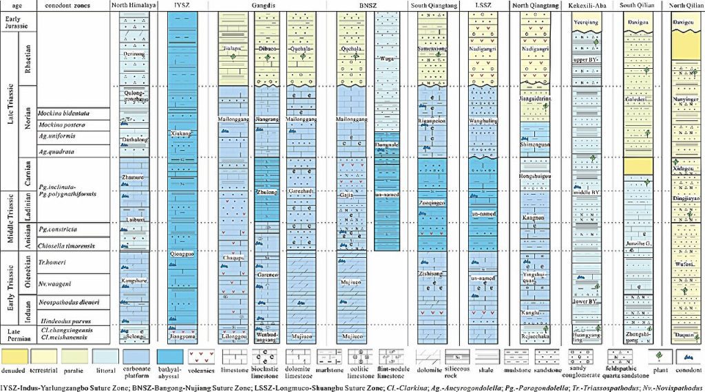 O primeiro compreende uma sucessão estratigráfica que reflete um aprofundamento de todo o QTP durante o período Carniano do Triássico Inferior ao Final; este último é amplamente representado por estratos que registram a transição de um ambiente marinho dominado por carbonatos para um ambiente costeiro e terrestre dominado por clásticos no período Noriano tardio no norte da IYSZ.