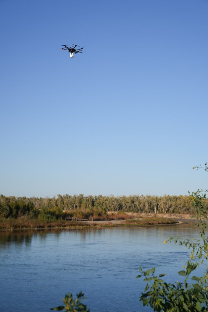 Um drone com a carga útil de mapeamento térmico StreamFlow voando sobre o Rio Sacramento no norte da Califórnia. Crédito: NASA/Massimo Vespignani