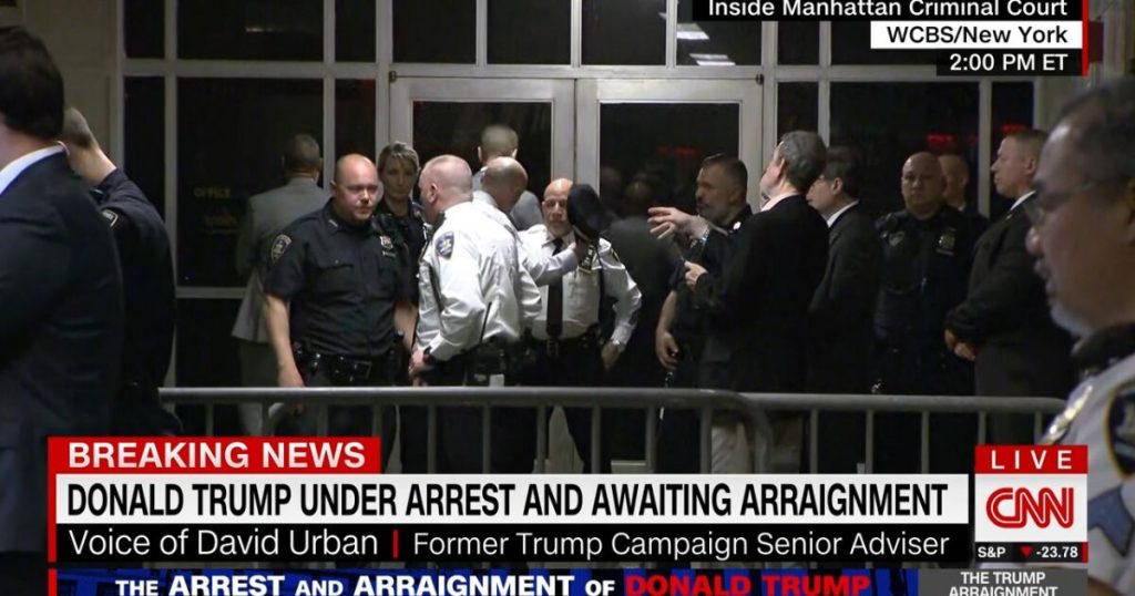 A CNN marcou sua cobertura com um título ameaçador na parte inferior da tela: “A prisão e acusação de Donald Trump”.