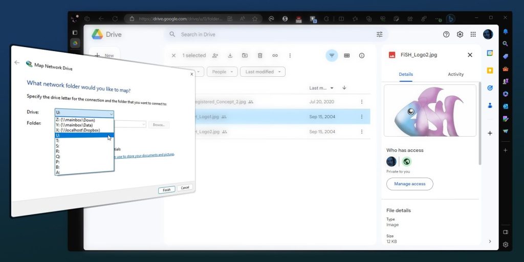 - Escolha o carta você deseja atribuir à sua pasta de armazenamento em nuvem no menu suspenso ao lado de Dirigir. Clique Terminar para aplicar a alteração.