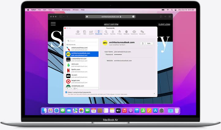 Selecione Senhas na guia na parte superior. Você precisará digitar sua senha do Mac ou usar o Touch ID para acessar suas senhas.