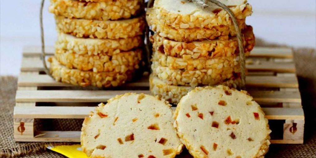 Misture a manteiga com um ovo levemente batido e o leite condensado e whey. Adicione a laranja cortada em pequenos pedaços e as farinhas. Misture até ficar homogêneo, mas firme. Faça um rolo com cerca de 4 cm de largura, embrulhe em filme plástico e deixe no freezer por cerca de 25 minutos. Retire o rolo do congelador e pinte com um ovo batido e cubra com as amêndoas. Reembale com filme plástico e deixe por mais 20 minutos no freezer. Retire o rolo e corte em fatias de meio centímetro mais ou menos. Coloque numa assadeira com papel vegetal e leve ao forno pré-aquecido a 150º por cerca de 20 minutos. Retire e deixe esfriar sobre uma gradinha.
