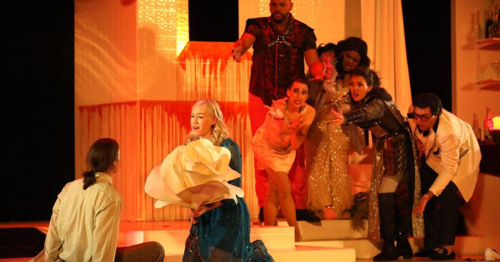 O Amante é um personagem de Alice no país das maravilhas de Soper, confrontado com todas as complexidades enlouquecedoras do amor moderno. Tivoli Treloar, uma jovem de 21 anos de graduação no programa de ópera da UCLA, soberbamente habita o palco como uma veterana em seu extraordinário primeiro papel profissional. Ela comanda uma parte épica, exalando uma confiança alcançada por meio de canções, árias operísticas e extensas práticas vocais de vanguarda. A estreia de “Rose” foi no sábado à noite. Em vez de permitir aos cantores alguns dias de descanso de que suas vozes precisam, a segunda apresentação foi uma matinê menos de 24 horas depois. Assisti àquela matinê e a voz de Treloar permaneceu fresca e brilhante.