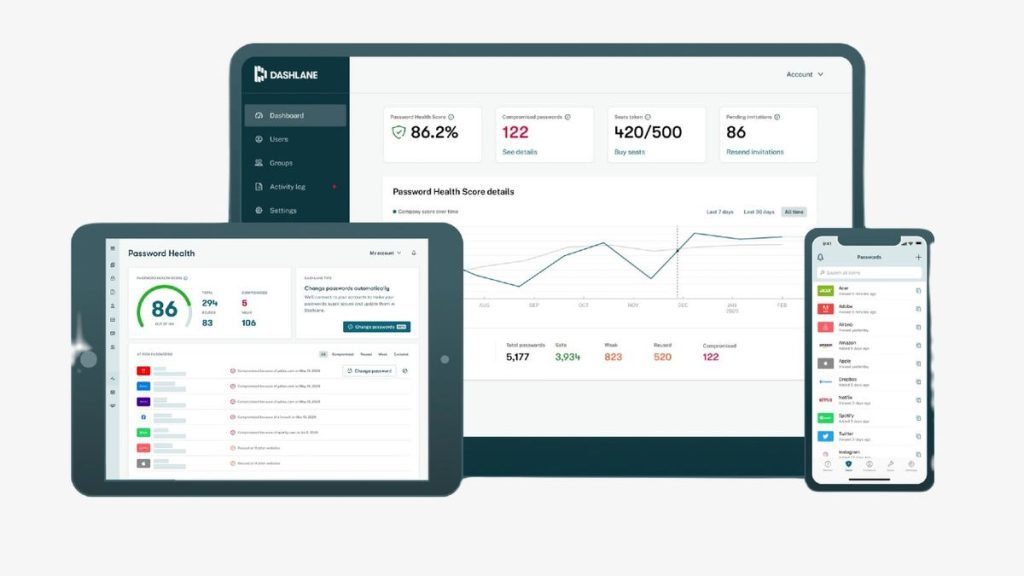 O Dashlane oferece gerenciamento simples de senhas em todos os dispositivos em todos os planos pessoais e empresariais.