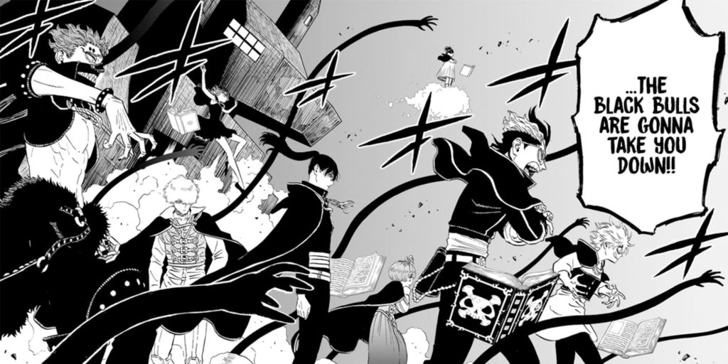 O capítulo anterior começou com Yuno e Lucius um contra o outro, e o último comenta que todos pareciam bastante obcecados por Asta; no entanto, ele garantirá que Asta não volte. Por outro lado, a batalha continuou na Floresta das Bruxas, onde vemos os Touros Negros iniciando um ataque contra Damnatio, que queria interromper a Porta do Destino, que seria usada para trazer Asta de volta.