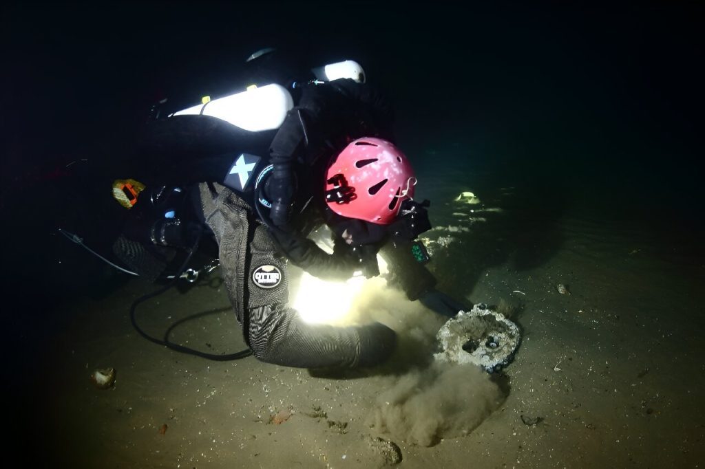 Uma imagem distribuída pela Atlantic Wreck Salvage mostra o mergulhador Joe Mazraani afastando areia para revelar um “deadeye” usado como parte do cordame de velas do Le Lyonnais.