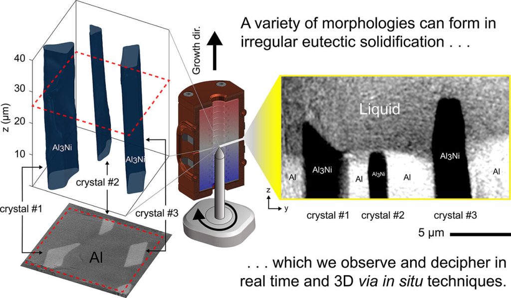 Com isso, eles observaram diretamente a interação entre o líquido, o alumínio (Al) e o alumineto de níquel (Al3Ni) durante a solidificação sob diferentes condições. A taxa de crescimento de Al3Ni comparado ao Al — chamado de grau de acoplamento — determinou a forma das microestruturas sólidas deixadas para trás.