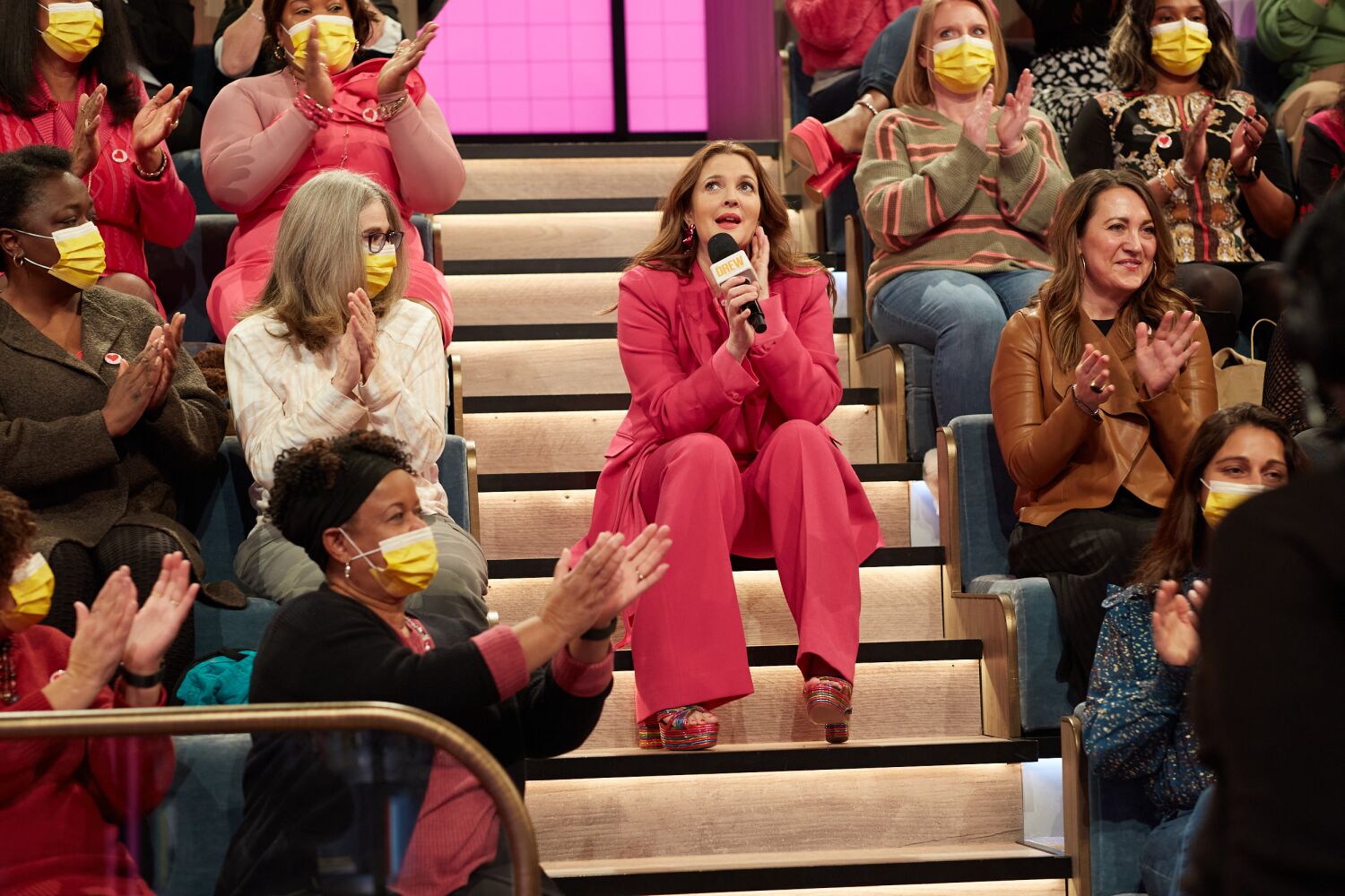 Então, quando a troca se tornou afetuosa, os dois mudaram sua conversa franca das poltronas de cetim rosa do show para o tapete no set de “The Drew Barrymore Show”. Em um recente perfil For Real With Amy Kaufman de Barrymore, a estrela de “ET” disse ao The Times que ajoelhar-se ou sentar-se no chão ao lado de seus convidados é uma preferência pessoal.
