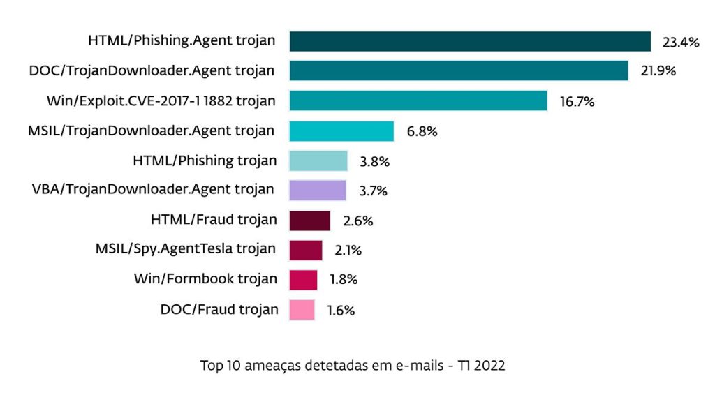 Despite active phishing activities, it was email spam campaigns, with malicious documents from the Emotet family of banking trojans, that are cited as the main reason for the growth of email threats. In March 2022, ESET saw a spike in large-scale Emotet email campaigns, detected as variants of DOC/TrojanDownloader.Agent. This increase was also registered in Portugal, and corresponds to some of the 10 main threats detected in the country in the first four months of the year.