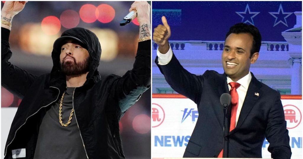 O artista de “Rap God” enviou recentemente uma carta de cessar e desistir ao candidato republicano à presidência, Vivek Ramaswamy, depois que o empresário que virou político cantou o hit de Eminem de 2002, “Lose Yourself”, na Feira Estadual de Iowa este mês. Um representante da licenciada musical BMI confirmou ao The Times que a empresa havia apresentado a carta em nome de Eminem.