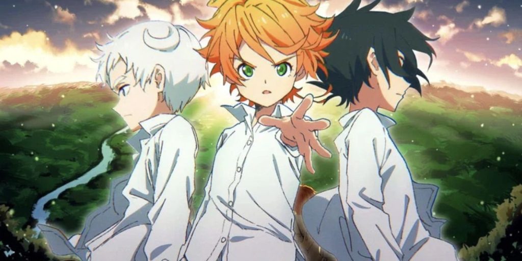 A Prometida Terra do Nunca conta a história de alguns órfãos superinteligentes em um orfanato que descobrem que aqueles que estão sendo “adotados” estão na verdade sendo enviados para o abate. Depois de descobrir esse segredo, Emma, ​​Norman e Ray decidem tirar todas as crianças daquele orfanato juntos. Elementos de terror psicológico são pesados ​​no começo, mas a série eventualmente muda para algo um pouco mais voltado para a aventura à medida que avança. Emma assume a posição de protagonista principal o tempo todo, fato que rendeu à série muitos elogios de fãs e críticos. Se certas forças criativas tivessem conseguido, porém, Emma teria sido transformada em um menino.