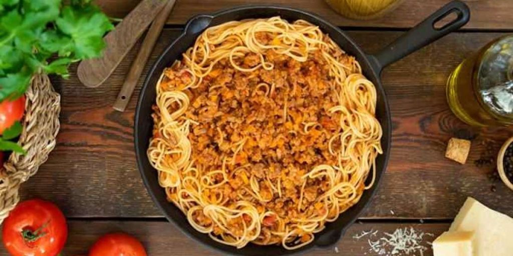Descasque e pique finamente a cebola, a cenoura e o aipo. Coloque uma panela com 2 colheres de óleo, em fogo médio-baixo, adicione os legumes e cozinhe por 12 min, mexendo de vez em quando. Adicione a carne moída e cozinhe por 7 min.