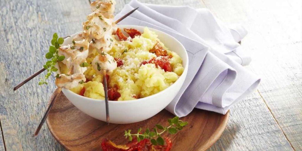 Corte o frango em cubos e forme 4 espetos. Tempere com pimenta e tomilho e cozinhe em uma frigideira com um fio de óleo por 3 minutos de cada lado.