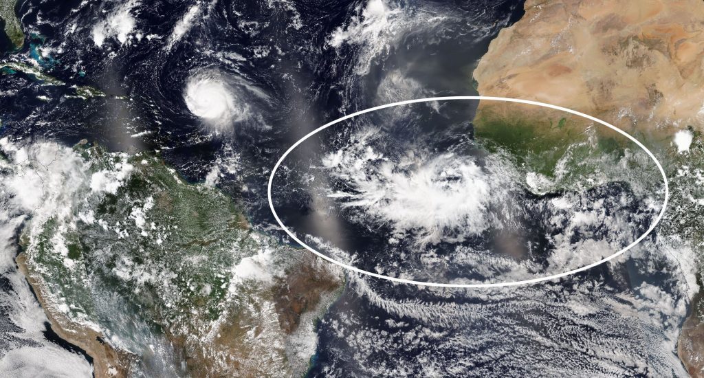 Imagens de satélite de 28 de setembro de 2021, mostrando maior nebulosidade e atividade de tempestades na costa da África. Essa atividade aumentada de tempestades foi intensificada por uma onda Kelvin atmosférica (a localização aproximada da onda Kelvin está circulada na imagem). Poucas horas após a captura dessa imagem, a onda Kelvin também ajudou a gerar a tempestade tropical Victor. Esse evento foi uma das ocorrências de ondas Kelvin simuladas neste estudo. Crédito: NASA Worldview