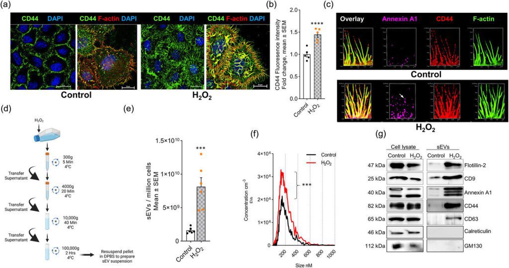 Estresse oxidativo induz formação de filopódios e secreção de sEVs derivados de filopódios CD9/CD44(+) em células Hela. Células Hela foram tratadas com ou sem H2O2 por 6 h para induzir estresse oxidativo e filopódios e sEVs analisados. Crédito: Revista de Vesículas Extracelulares (2024). DOI: 10.1002/jev2.12477