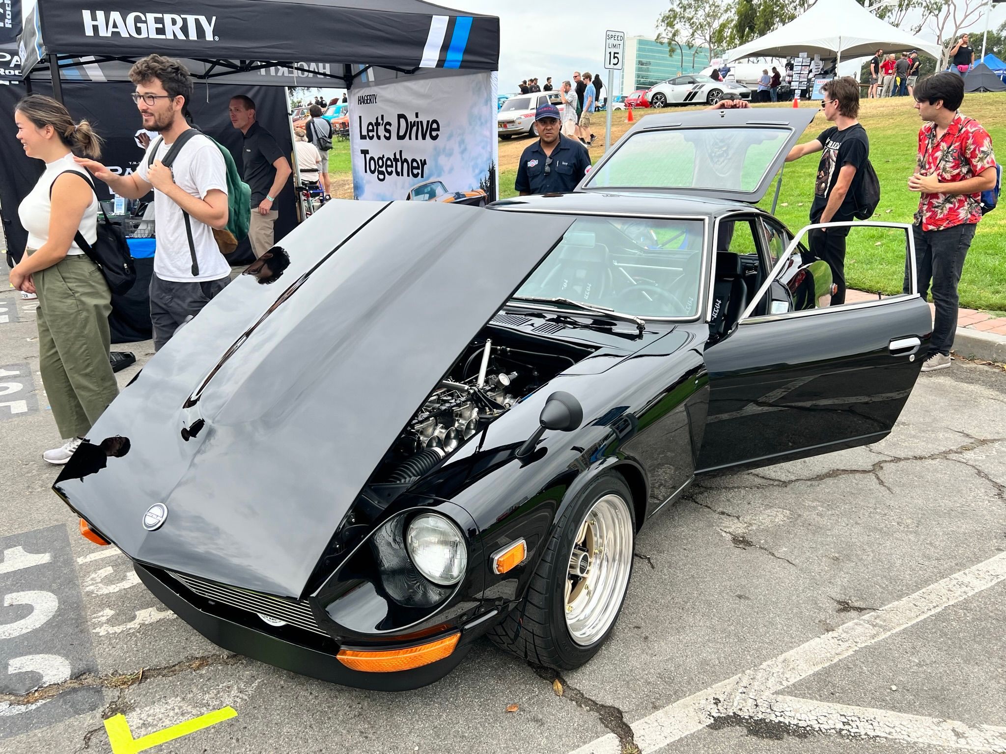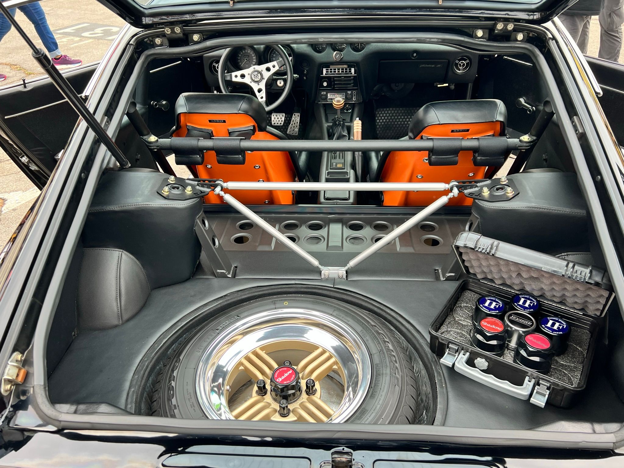 O estande da Hagerty apresentava um impressionante Nissan Fairlady Z preto dos anos 70. O compartimento do motor dobrado? Nem um grão de poeira. O interior? Baldes de couro personalizados com câmbio em madeira Balsa e alça de freio eletrônico. O porta-malas apresentava armazenamento com acabamento em couro para o sobressalente de tamanho normal: uma roda forjada Izanami Devil Japan de 14 polegadas correspondente.