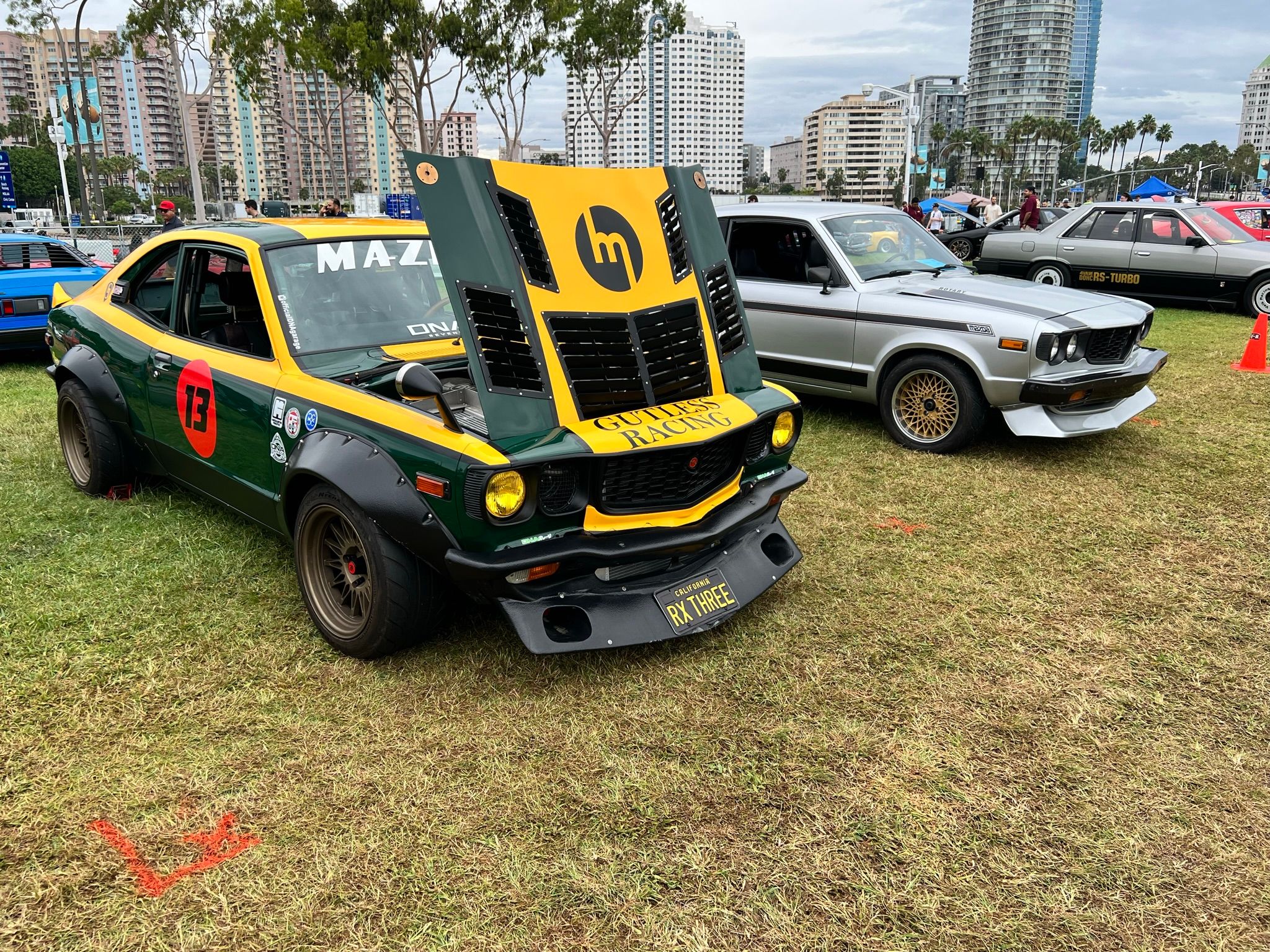 Primeiro tivemos a oportunidade de conferir a seleção da Mazda e ela não decepcionou. Havia uma grande variedade de cupês RX-3 dos anos 70 em estilos e cores variados. Um carro de corrida RX-3 com pintura dourada e verde apresentava um motor louco de 3 rotores. Se ao menos pudéssemos ouvi-lo começar.