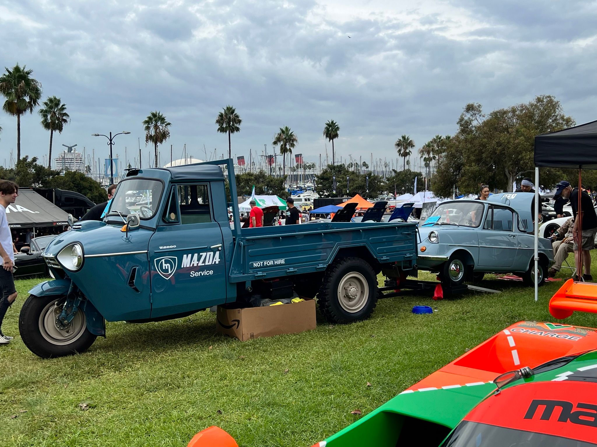 Outra surpresa absoluta estava na porta ao lado, um caminhão de reboque de três rodas T2000 1962. É o único exemplar LHD existente nos EUA. Ele estava rebocando outro veículo incrível, o mini cupê R360 1964. O desenvolvimento do R360, que é o primeiro automóvel da Mazda, foi supervisionado pelo pai do rotativo Mazda, Kenichi Yamamoto. Ele pesava 870 libras e produzia impressionantes 16 cavalos de potência com seu motor traseiro V-2 de 356 cc. Sim, são oito cavalos de potência por cilindro. Dois deles. Em configuração V no porta-malas. Quão longe os carros chegaram!