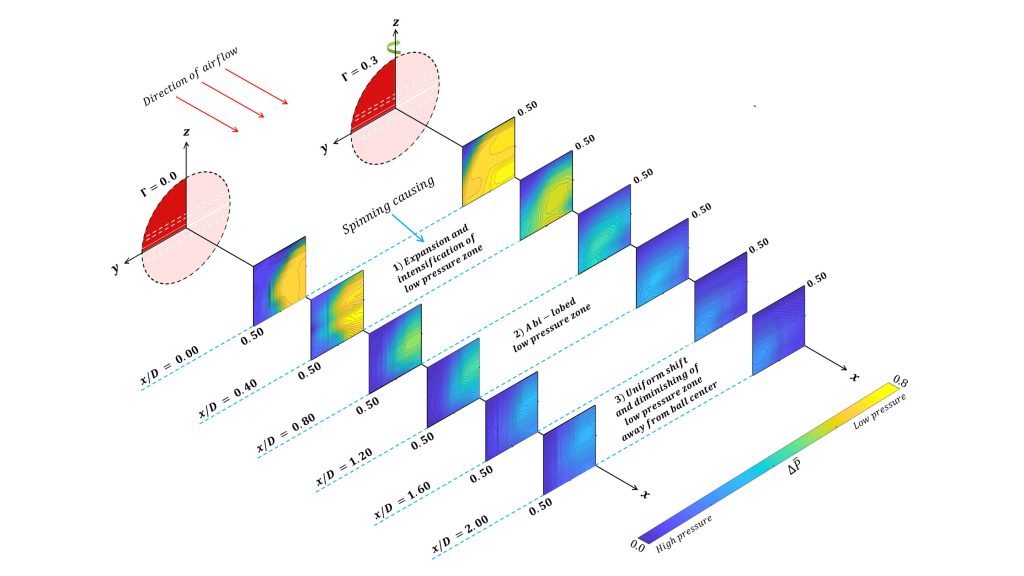O grupo descobriu que zonas de baixa pressão se expandiam e se intensificavam perto da bola ao girar, enquanto essas zonas mudavam e diminuíam a jusante. Em taxas de rotação mais altas, a zona de baixa pressão começa a mudar para uma forma bilobada persistente.