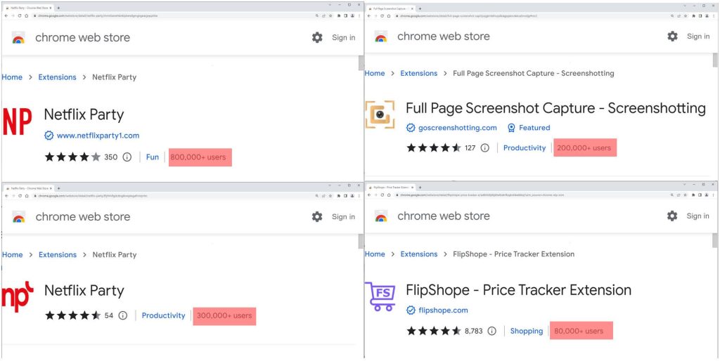 Duas das extensões se disfarçavam de funções que permitiam aos usuários realizar festas de exibição da Netflix, enquanto outra representava uma extensão de captura de tela. O mais pertinente aos objetivos dos golpistas eram extensões para rastreamento de preços e detecção automática de vendas em flash.