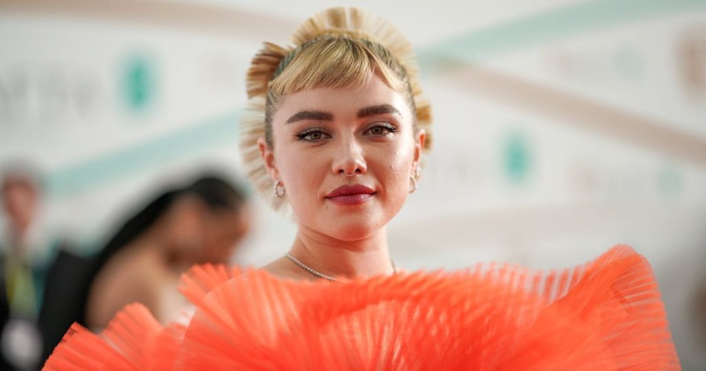 Florence Pugh impressionou na noite de domingo em um atraente vestido rabo de peixe laranja para o 76º British Academy Film Awards em Londres.