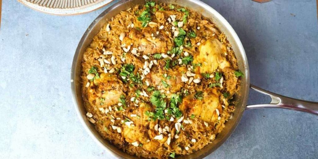 Junte o arroz basmati à cebola e às especiarias, depois acrescente o leite de coco e 1/2 xícara de água fervida. Mexa bem, leve para ferver e coloque as coxas de frango de volta na panela por cima do arroz.
