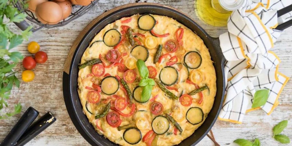 Corte a cebola e os pimentos As abobrinhas fatiadas, os aspargos em cubos de 1,5 cm (descartando a parte grossa do caule) e os tomates cereja pela metade.Em uma frigideira com 2 colheres de sopa de azeite e em fogo médio, refogue a cebola e os pimentões. fogo médio por 5 minutos. Adicione as fatias de abobrinha e os aspargos e refogue por 15 minutos, mexendo de vez em quando. Deixou de lado. Numa panela aqueça a água com leite e whey. Despeje o purê de batata, deixe repousar uns instantes e mexa até obter um puré espesso. Aqueça o forno a 180º. Bata os ovos, junte sal e pimenta, junte o puré e misture. Adicione o queijo e os vegetais (separando alguns) e misture novamente. Pincele com 1 colher de sopa de azeite numa frigideira de cerca de 24 cm (sem a pega) ou num recipiente próprio para ir ao forno. Verta a mistura e distribua o vegetais reservados e tomates cereja Asse por cerca de 35-40 min. até definir.