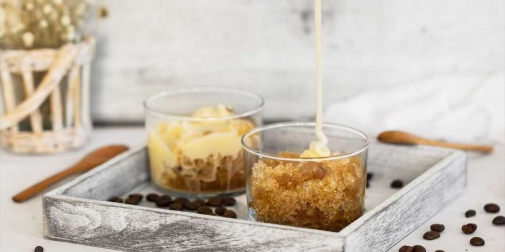Despeje o conteúdo das 2 cápsulas de Nescafé Dolce Gusto Americano em uma bandeja e deixe descansar no freezer. Após 20 minutos, raspe a superfície com um garfo para quebrar os cristais de gelo e evitar que tudo congele na forma de um bloco. Repita este passo 2 vezes até obter a textura da granizo. Sirva e acrescente o leite condensado junto com whey.