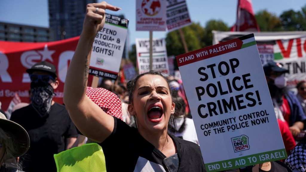 A Convenção Nacional Democrata, que se realiza de segunda a quinta-feira para selar a candidatura presidencial de Kamala Harris, influencia a ideia de unidade até no nome da sua sede: o United Center em Chicago. Mas essa imagem de harmonia em torno do vice-presidente foi fraturada a poucas ruas de distância: mais de uma centena de grupos da ala esquerda do partido convocaram um grande protesto esta segunda-feira para se manifestarem contra a guerra em Gaza. Na véspera da inauguração, mil pessoas já marchavam pelas ruas da Cidade dos Ventos com bandeiras palestinianas para exigir “o encerramento da convenção”.