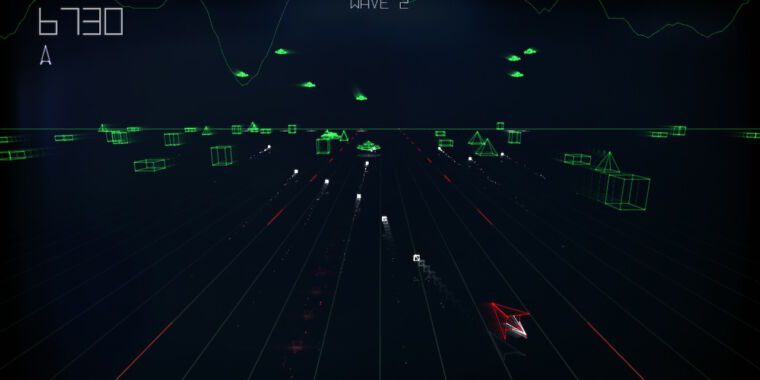 Essa busca pela autenticidade do vetor inclui pequenos toques como emular o “efeito fósforo” que leva a imagens borradas que persistem na tela por uma fração de segundo após o desaparecimento de uma linha vetorial. Williams disse que também se deu ao trabalho de calcular a sutil “floração” fantasmagórica que pisca em torno das linhas individuais do monitor vetorial (e pulsa de forma convincente com a trilha sonora de graves pesados, em Vctr Sctrcaso de).