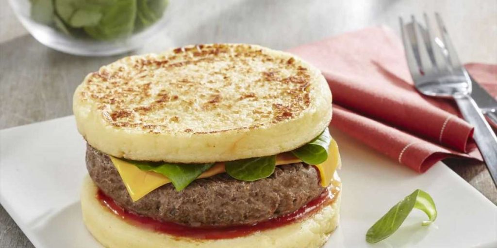 Em cada prato, monte os hambúrgueres: organize uma panqueca de batata, uma colher de sopa de pimentão frito, um hambúrguer, uma fatia de queijo, alface e outra panqueca de batata. Serva quente.