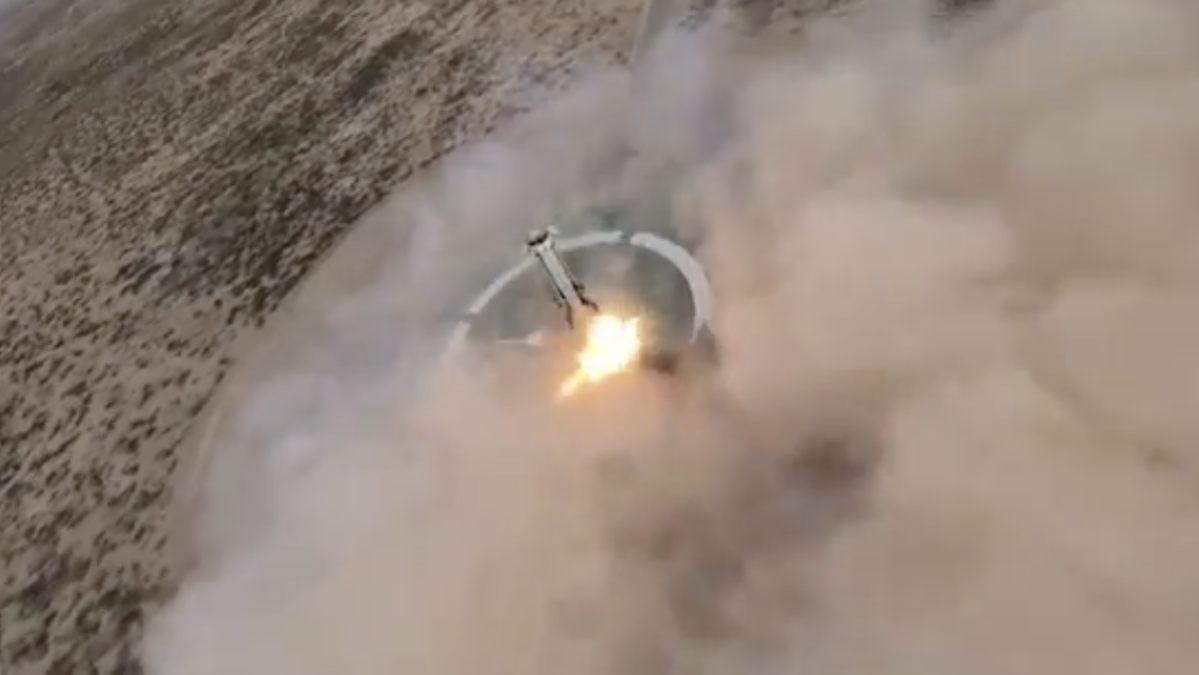 A cerca de 10 segundos do vídeo, você pode ver o booster chutar a poeira no deserto, pois corrige sua trajetória logo acima da superfície e se move para o centro do LaunchPad, que é pintado com o logotipo de penas da Blue Origin. (“A pena representa nossa busca incansável da perfeição do voo e a promessa de um retorno gracioso e seguro ao planeta Terra, assim como a descendência suave de uma pena através de nossa preciosa atmosfera”, explica a empresa.)