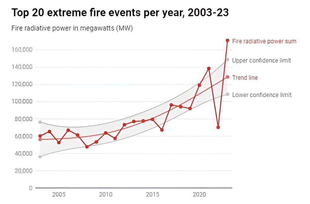 Os últimos sete anos incluíram os seis mais extremos no período de 21 anos. Este aumento ocorreu em sintonia com o aquecimento global, com 2023 quebrando recordes de temperatura e também tendo os incêndios mais intensos.