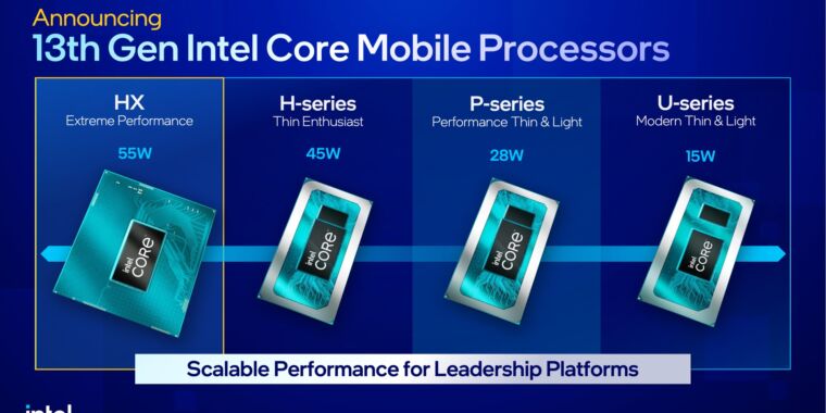 A Intel passou a maior parte de sua apresentação falando sobre os processadores high-end da série HX, principalmente porque eles são os únicos significativamente diferentes de seus predecessores de 12ª geração. Os processadores de laptop HX são essencialmente as CPUs de desktop Raptor Lake da Intel, reembaladas para serem soldadas a uma placa-mãe de laptop. Como essas CPUs de desktop, todas incluem E-cores adicionais em relação às CPUs de 12ª geração. Os processadores Core i9 e o i7-13850HX também suportam RAM DDR5-5600 mais rápida, embora os outros fiquem com DDR5-4800.