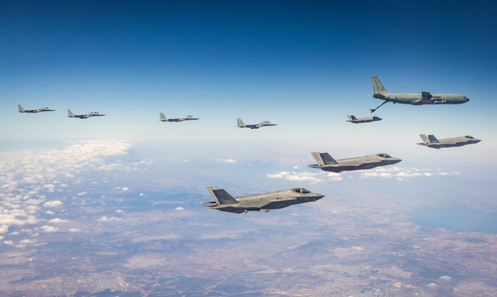 O exercício, realizado na quinta-feira, envolveu aeronaves importantes da frota israelense, incluindo as aeronaves de reabastecimento “Adir” (F-35i), “Baz” (F-15) e “Ram” (Boeing 707).