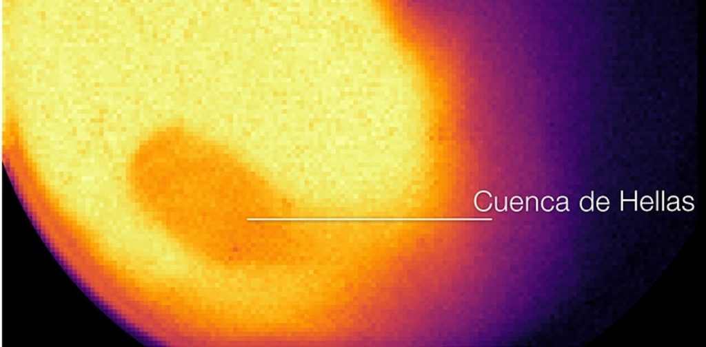 Yerin enlemi ile sıcaklık farkları dikkat çekicidir, ayrıca Hellas havzasının atmosferik etkilerden dolayı kararması da dikkat çekicidir.