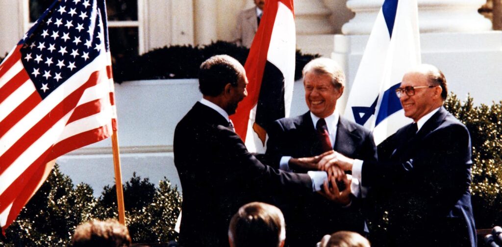 Na esfera das relações exteriores, o único mandato de Jimmy Carter como presidente dos EUA (1977-1981) teve algumas conquistas notáveis. O mais significativo foram os acordos de Camp David de 1978. Carter, o primeiro-ministro israelita Menachem Begin e o presidente egípcio Anwar Sadat assinaram um acordo que viu Begin concordar em renunciar a toda a Península do Sinai, capturada por Israel na guerra de seis dias de 1967, em troca de paz e relações diplomáticas plenas com o Egipto.