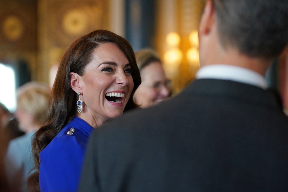 A princesa de Gales fala com convidados na sexta-feira durante uma recepção para convidados estrangeiros que compareceram à coroação do rei Carlos III.