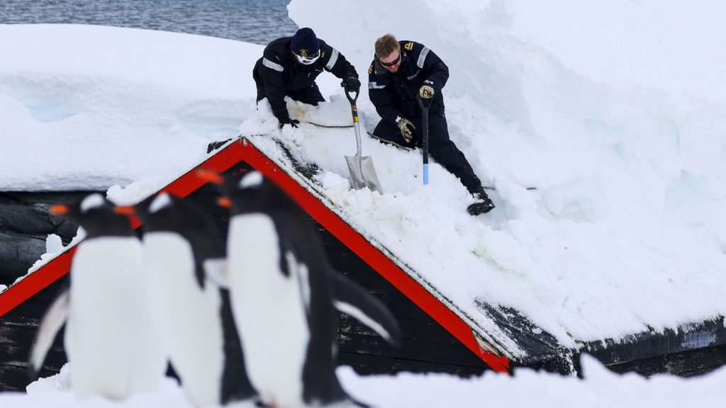Uma equipe de marinheiros e fuzileiros navais reais do navio da Marinha Real HMS Protector deslocou várias toneladas de neve e realizou reparos temporários.